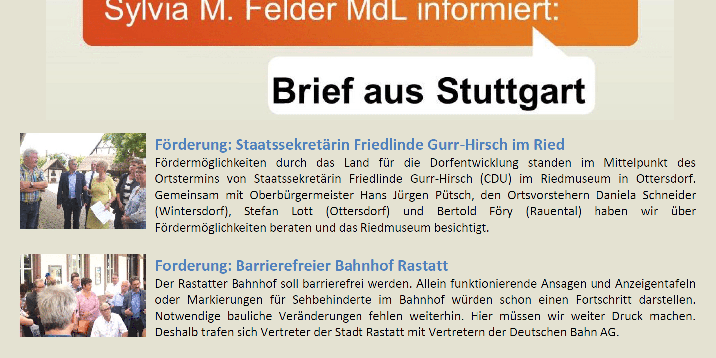 Aug.92017Brief aus Stuttgart 9. August 2017Weitere ThemenSylvia Felder MdL: Mittel aus dem Kommunalen Sanierungsfonds des Landes für Schulen im Wahlkreis29. März 2019Sylvia M. Felder: Das PFC-Grundwassermodell soll im Jahresprogramm der LUBW weitergeführt werden22. März 2019Landwirtschaftsminister Peter Hauk kommt nach Gaggenau: „Artenvielfalt in unseren Kommunen erhalten“12. März 2019März 20193. März 2019Sylvia M. Felder: Vorerntemonitoring für PFC-belastete Böden soll weitergeführt werden15. Februar 2019ELR Förderung von Projekten durch das Land14. Februar 2019