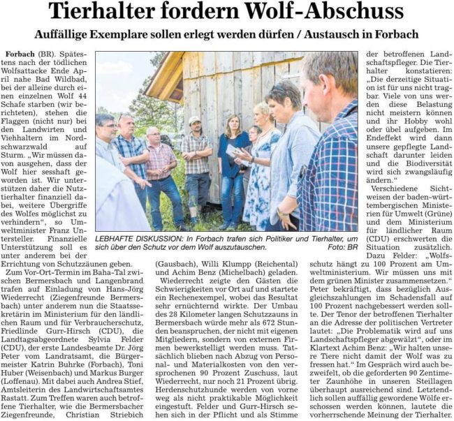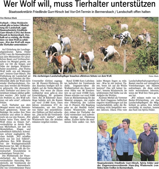 …. erfordert Anstrengungen bei dem Schutz der Weidetiere. Kommunen, Tierhalter und das Land müssen hier zu Lösungen kommen. Deshalb kommt die Staatssekretärin im Ministerium für den Ländlichen Raum und für Verbraucherschutz, Friedlinde Gurr-Hirsch MdL, zu einem Vor-Ort-Termin nach Forbach-Bermersbach, zu dem ich Sie herzlich einlade. Wir treffen uns am Mittwoch, den 25. Juli 2018 10:00…