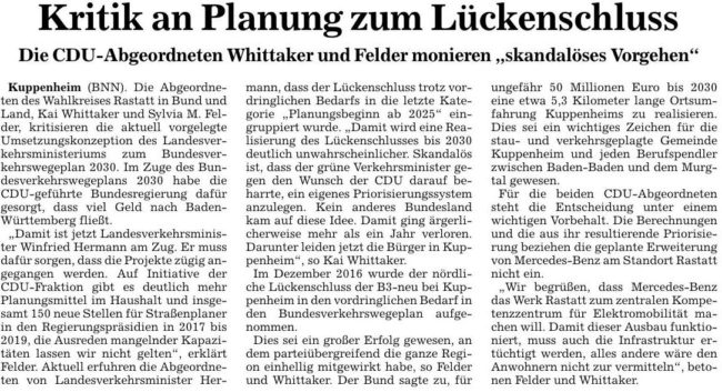 Verzögerung des Lückenschlusses der B3 neu bei Kuppenheim inakzeptabel