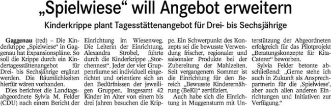„Spielwiese“ schmiedet Zukunftspläne Pressemitteilungen, StartseiteVon Maren Schmidt-Peker31. Januar 2018Landtagsabgeordnete Sylvia M. Felder (CDU) informiert sich in Gaggenau über neueste Entwicklungen