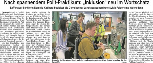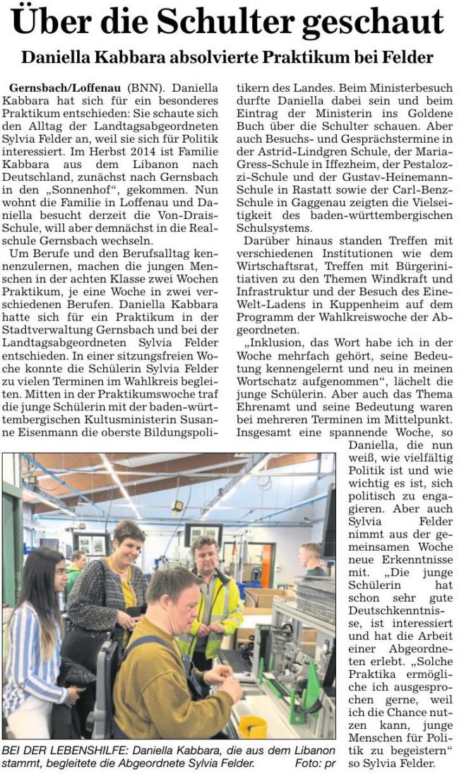 Schulpraktikum: Daniella Kabbara bei Landtagsabgeordneter PressemitteilungenVon Maren Schmidt-Peker4. Februar 2017„Inklusion“ neu im Wortschatz Sylvia Felder freut sich über Interesse an Politik