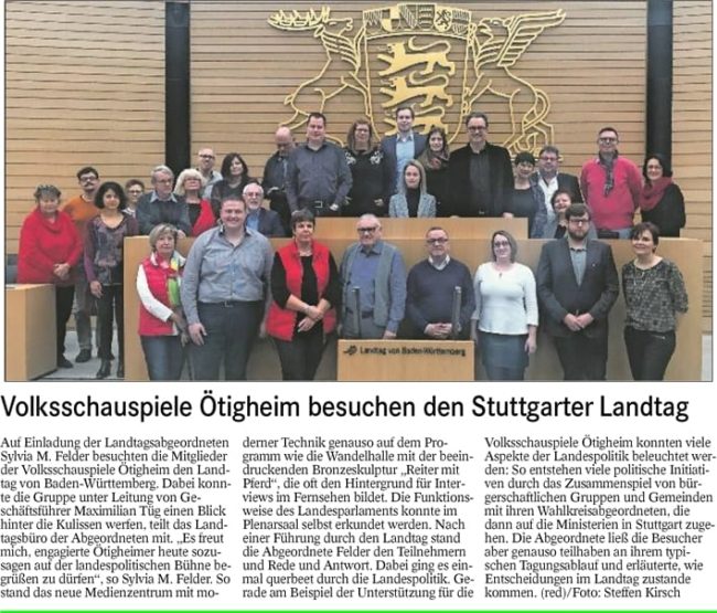 Auf Einladung der Landtagsabgeordneten Sylvia M. Felder besuchten die Mitglieder der Volksschauspiele Ötigheim den Landtag von Baden-Württemberg.