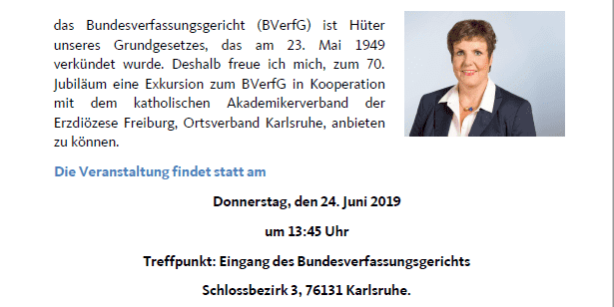 Jan.282019Einladung zum Besuch des Bundesverfassungsgerichts 28. Januar 2019Weitere ThemenSylvia Felder MdL: Mittel aus dem Kommunalen Sanierungsfonds des Landes für Schulen im Wahlkreis29. März 2019Sylvia M. Felder: Das PFC-Grundwassermodell soll im Jahresprogramm der LUBW weitergeführt werden22. März 2019Landwirtschaftsminister Peter Hauk kommt nach Gaggenau: „Artenvielfalt in unseren Kommunen erhalten“12. März 2019März 20193. März 2019Sylvia M. Felder: Vorerntemonitoring für PFC-belastete Böden soll weitergeführt werden15. Februar 2019ELR Förderung von Projekten durch das Land14. Februar 2019