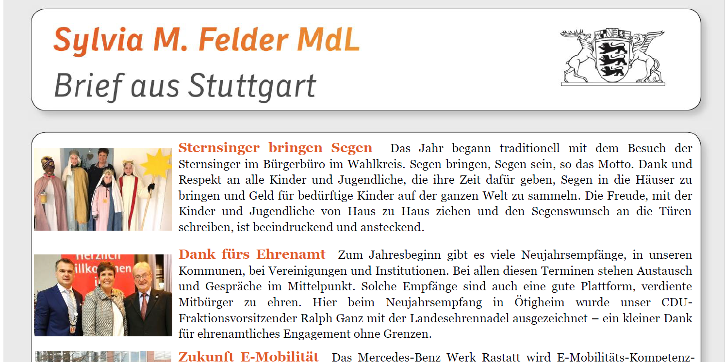 Feb.42018Brief aus Stuttgart 4. Februar 2018Weitere ThemenSylvia Felder MdL: Mittel aus dem Kommunalen Sanierungsfonds des Landes für Schulen im Wahlkreis29. März 2019Sylvia M. Felder: Das PFC-Grundwassermodell soll im Jahresprogramm der LUBW weitergeführt werden22. März 2019Landwirtschaftsminister Peter Hauk kommt nach Gaggenau: „Artenvielfalt in unseren Kommunen erhalten“12. März 2019März 20193. März 2019Sylvia M. Felder: Vorerntemonitoring für PFC-belastete Böden soll weitergeführt werden15. Februar 2019ELR Förderung von Projekten durch das Land14. Februar 2019