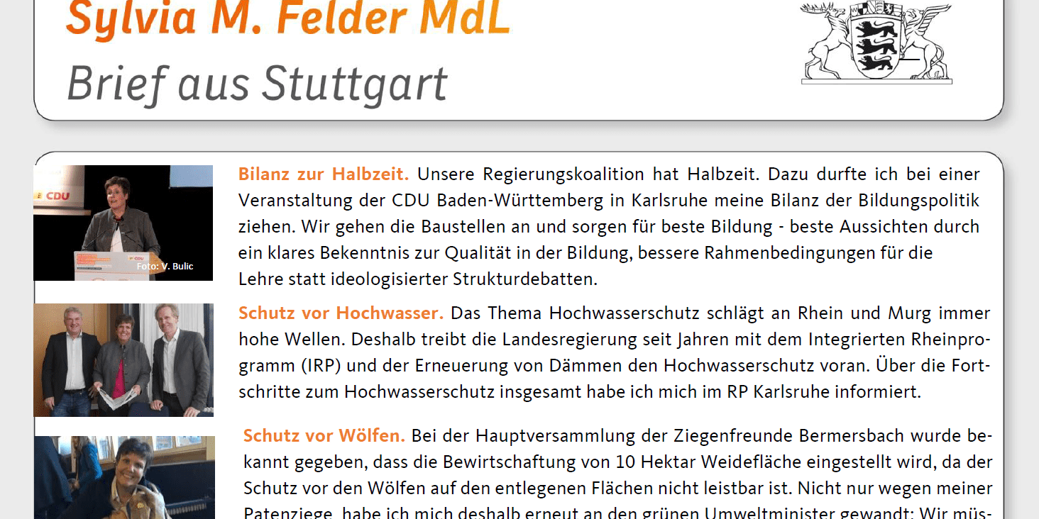 Feb.32019Brief aus Stuttgart 3. Februar 2019Weitere ThemenSylvia Felder MdL: Mittel aus dem Kommunalen Sanierungsfonds des Landes für Schulen im Wahlkreis29. März 2019Sylvia M. Felder: Das PFC-Grundwassermodell soll im Jahresprogramm der LUBW weitergeführt werden22. März 2019Landwirtschaftsminister Peter Hauk kommt nach Gaggenau: „Artenvielfalt in unseren Kommunen erhalten“12. März 2019März 20193. März 2019Sylvia M. Felder: Vorerntemonitoring für PFC-belastete Böden soll weitergeführt werden15. Februar 2019ELR Förderung von Projekten durch das Land14. Februar 2019