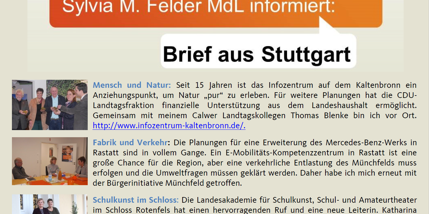 Jan.82018Brief aus Stuttgart 8. Januar 2018Weitere ThemenSylvia Felder MdL: Mittel aus dem Kommunalen Sanierungsfonds des Landes für Schulen im Wahlkreis29. März 2019Sylvia M. Felder: Das PFC-Grundwassermodell soll im Jahresprogramm der LUBW weitergeführt werden22. März 2019Landwirtschaftsminister Peter Hauk kommt nach Gaggenau: „Artenvielfalt in unseren Kommunen erhalten“12. März 2019März 20193. März 2019Sylvia M. Felder: Vorerntemonitoring für PFC-belastete Böden soll weitergeführt werden15. Februar 2019ELR Förderung von Projekten durch das Land14. Februar 2019