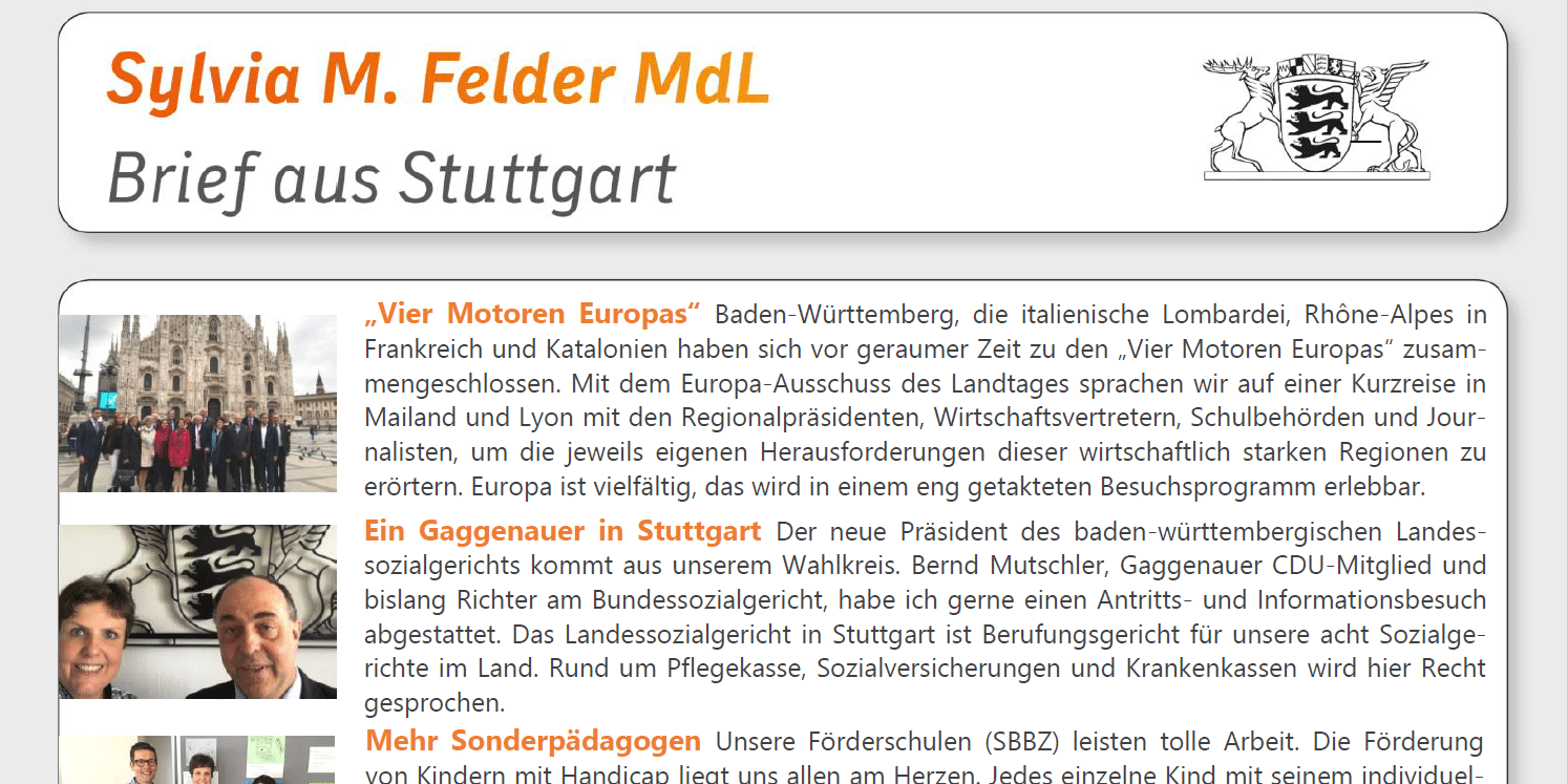 Juni22018Brief aus Stuttgart 2. Juni 2018Weitere ThemenSylvia Felder MdL: Mittel aus dem Kommunalen Sanierungsfonds des Landes für Schulen im Wahlkreis29. März 2019Sylvia M. Felder: Das PFC-Grundwassermodell soll im Jahresprogramm der LUBW weitergeführt werden22. März 2019Landwirtschaftsminister Peter Hauk kommt nach Gaggenau: „Artenvielfalt in unseren Kommunen erhalten“12. März 2019März 20193. März 2019Sylvia M. Felder: Vorerntemonitoring für PFC-belastete Böden soll weitergeführt werden15. Februar 2019ELR Förderung von Projekten durch das Land14. Februar 2019