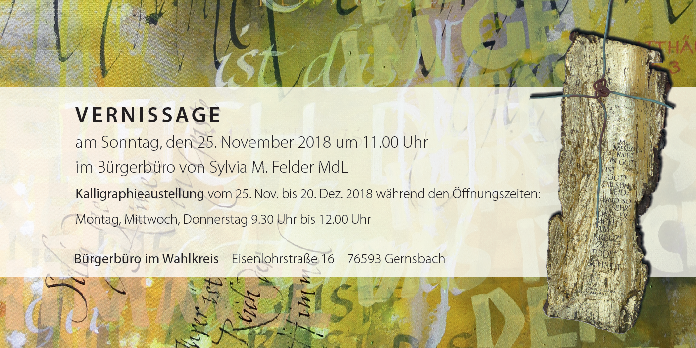 „Kunst trifft Politik“- unter diesem Motto treffen der Künstler Markus Kurz und Landtagsmitglied Sylvia M. Felder zusammen. Ab Sonntag, 25. November stellt Kurz im Bürgerbüro der Landtagsabgeordneten aus. „Das Bürgerbüro wird zur Begegnung mit Kunst“ so Felder. Nach der Eröffnung ist die Ausstellung zu den Öffnungszeiten des Bürgerbüros (www.sylvia-felder.de) oder nach Absprache zu besichtigen.